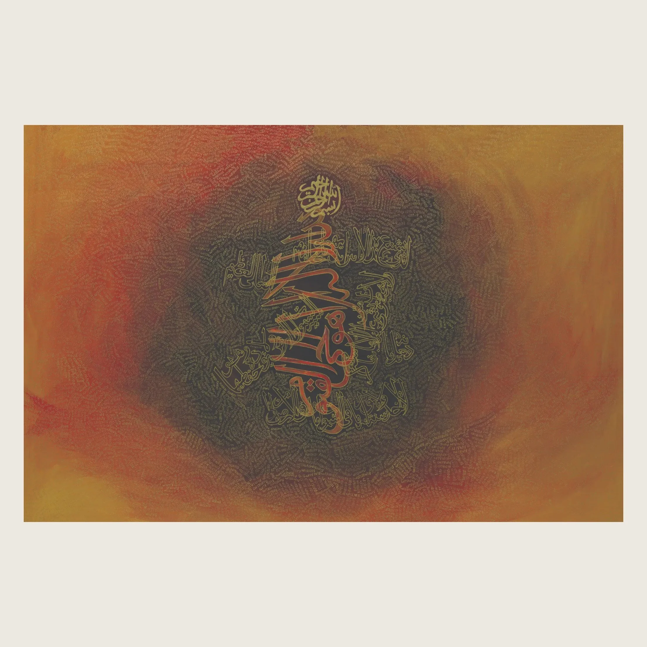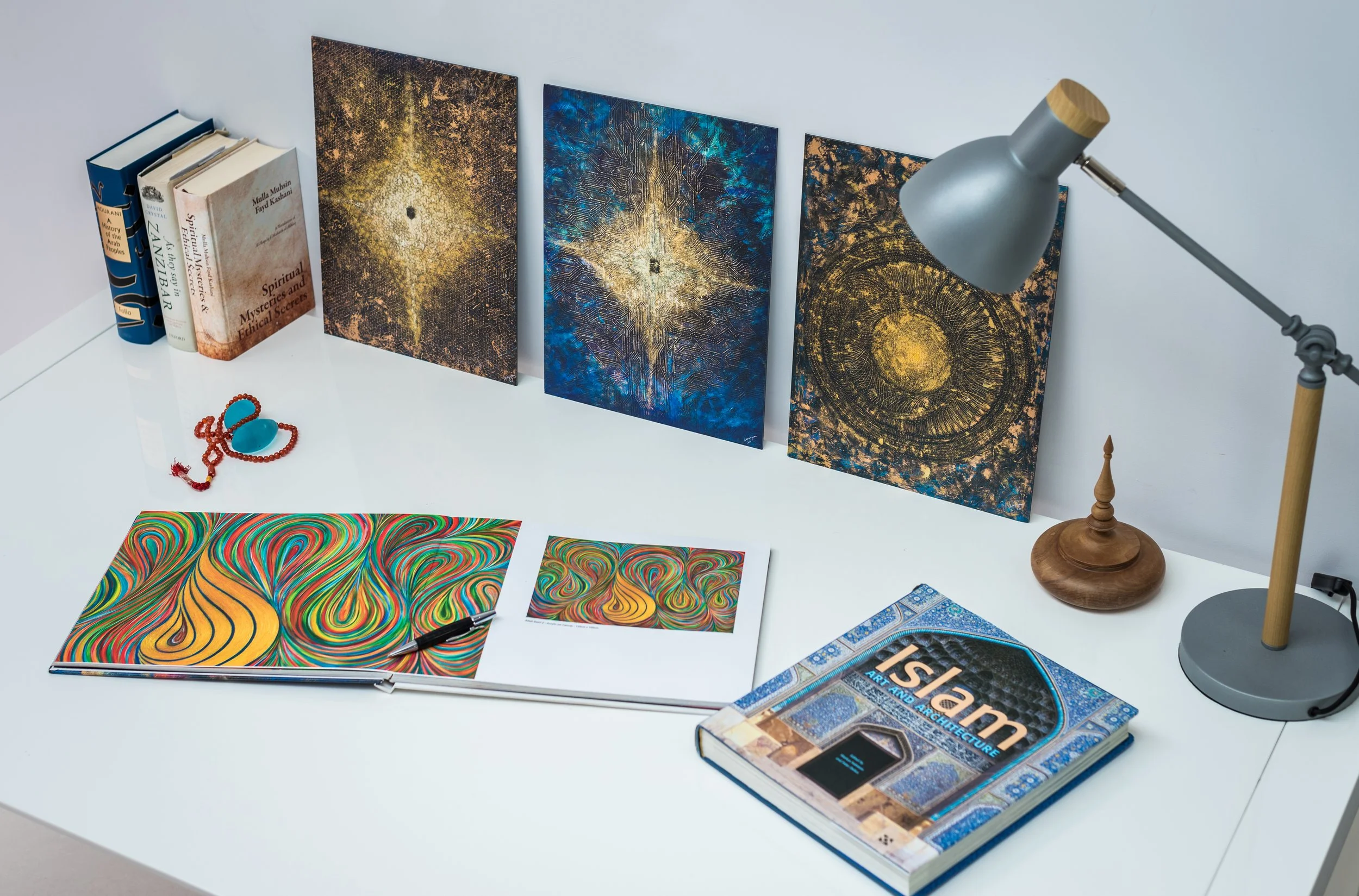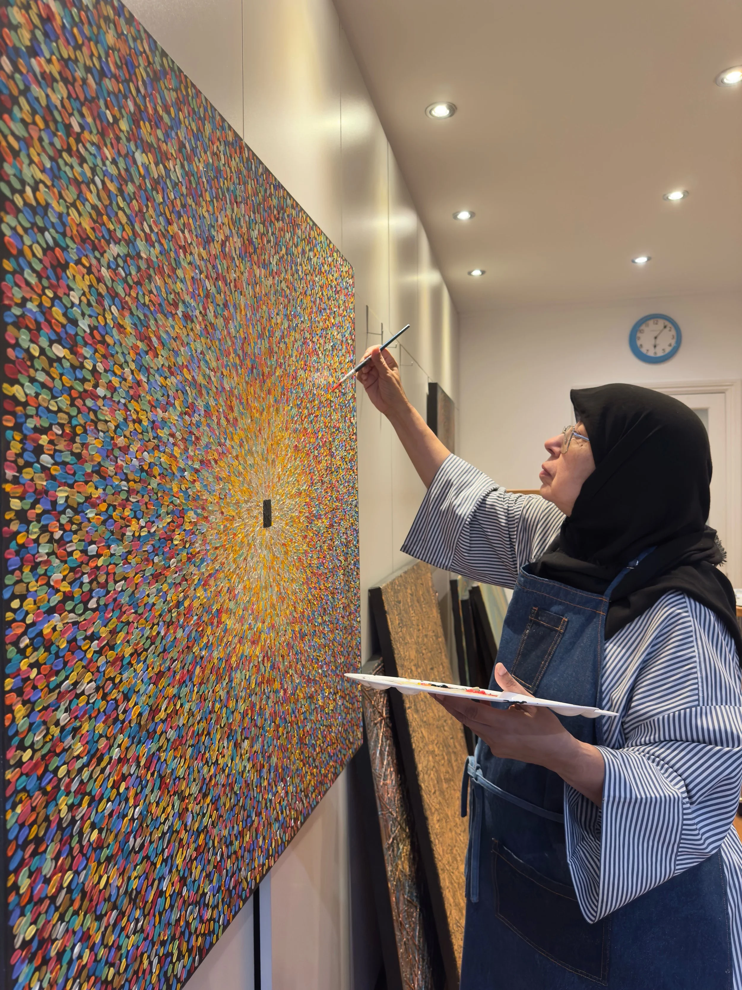 I build each piece through vibrant layers, with intricate patterns and calligraphy that carry meaning beyond aesthetics. When I inscribe the name of God over and over again on the canvas, it becomes my personal tasbih, a quiet, rhythmic expression of worship.