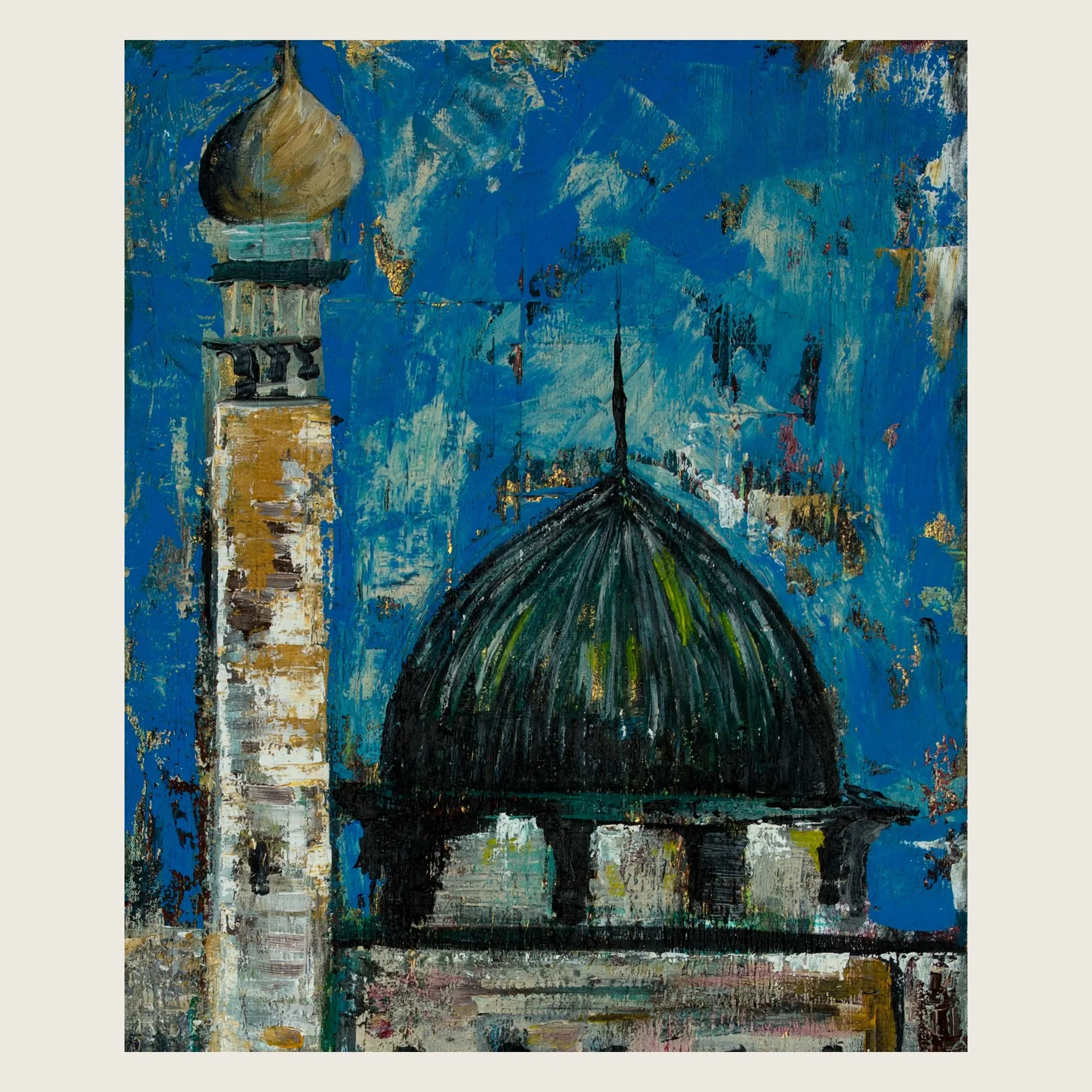 Masjid Al-Aqsa is the third holiest site in Islam, the place from which the Prophet Muhammad (SAW) ascended to the heavens on the Night Journey, and a symbol of Palestinian identity that has endured for centuries. This painting does not try to document it. It tries to hold it. The dome rises from a deep blue, the minaret stands firm beside it, and the first revelation, Surah Alaq, is written into the facade. A reminder that this place is not only sacred history. It is still here. Still standing.