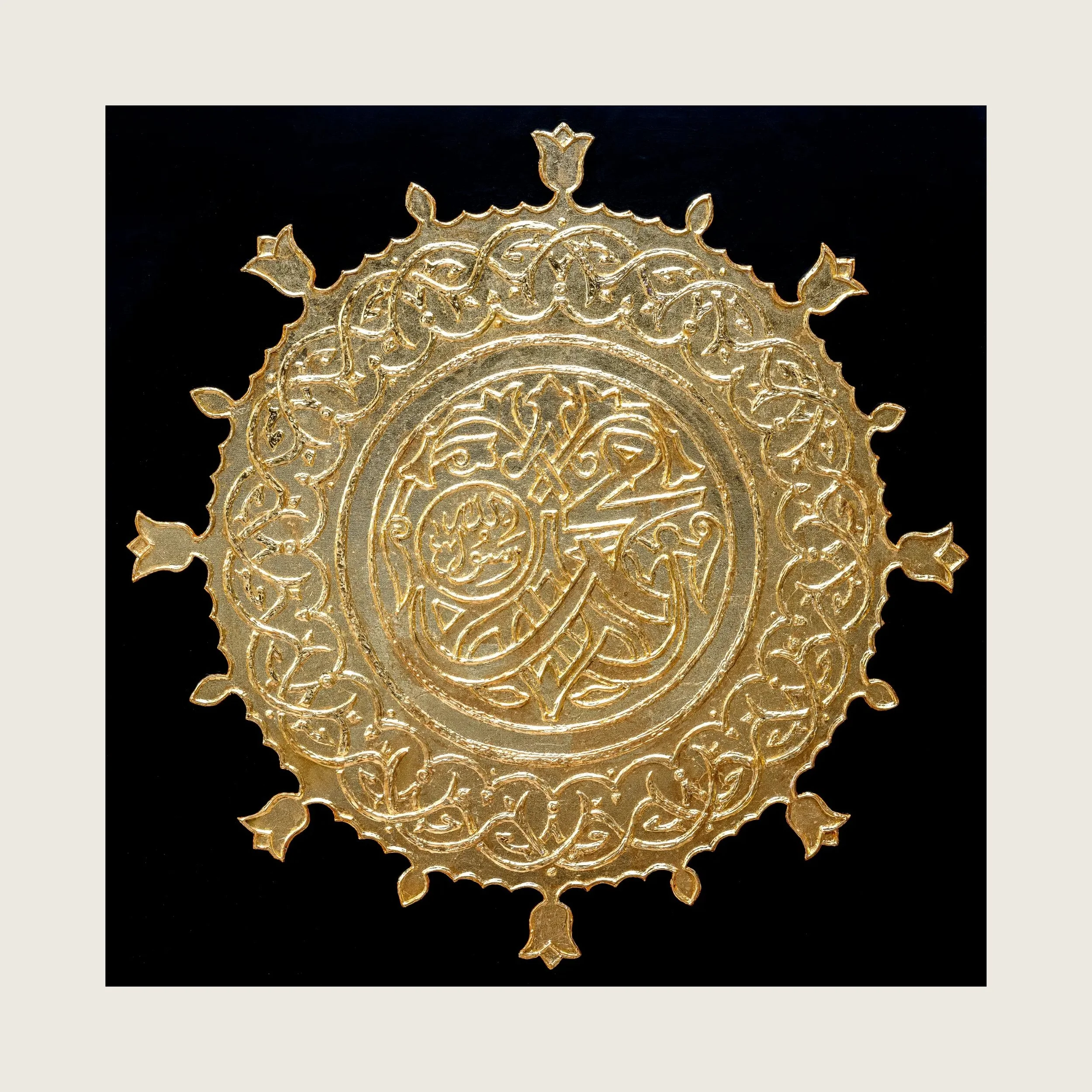 This painting is a portrayal of the motif adorning the door of Masjid un Nabawi in Madina. Thick layers of paint sculpt a tactile relief against a velvety black canvas, bringing the intricate design to life. This painting serves as a visual hymn, inviting you to contemplate the spiritual significance of the motif.
