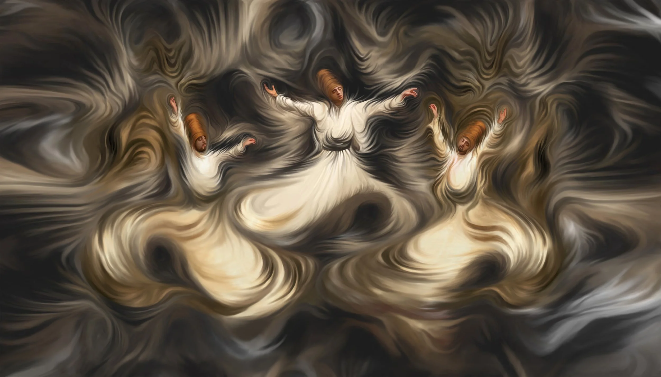 This digitally created painting depicts the mystical transformation of a trio of whirling dervishes into celestial brushes, leaving ethereal traces of their graceful movements. Their swirling dance, suggestive of rising incense, tells stories of profound meditation and steadfast devotion to the Divine. The captivating dance in this artwork encourages souls to heightened spirituality and an unbreakable connection with the One God.